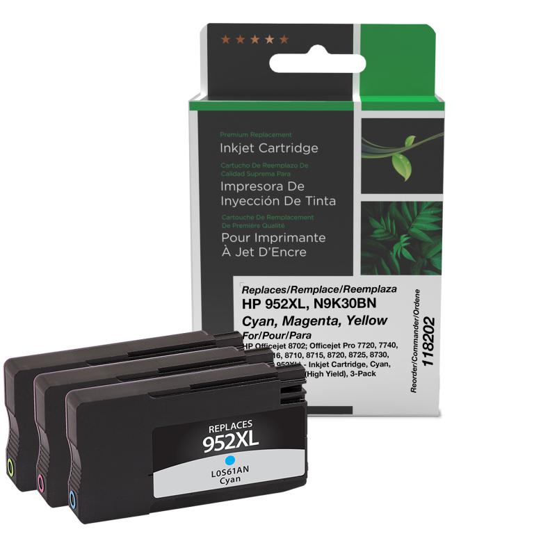 - Remanufactured High Yield Cyan, Magenta, Yellow Ink Cartridges for HP 952XL (N9K30BN) 3-Pack
