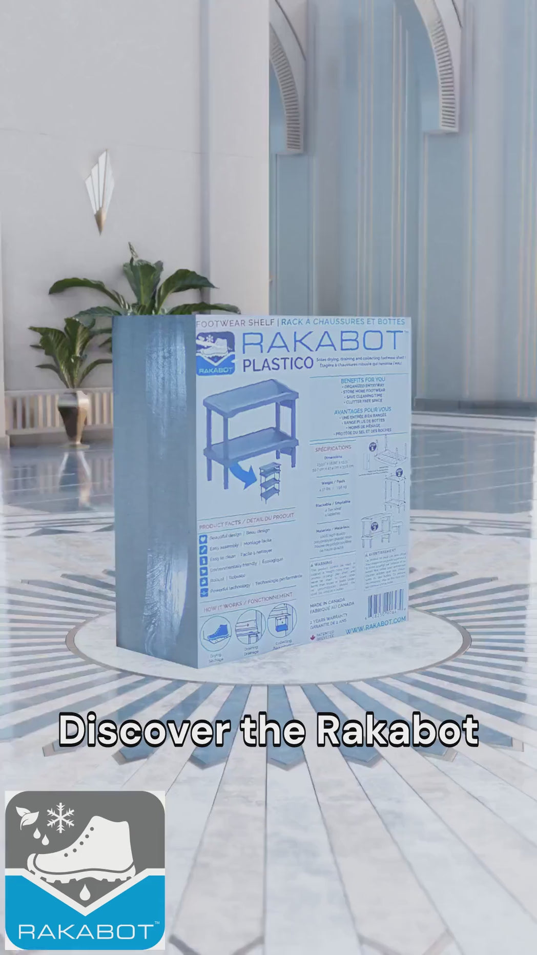 - DRIES SOLES : Our patented technology with unique V-shaped shelves allows soles to drain and dry quickly. The Rakabot shelf gutter allows the water to drain from footwear to the easy to empty container.